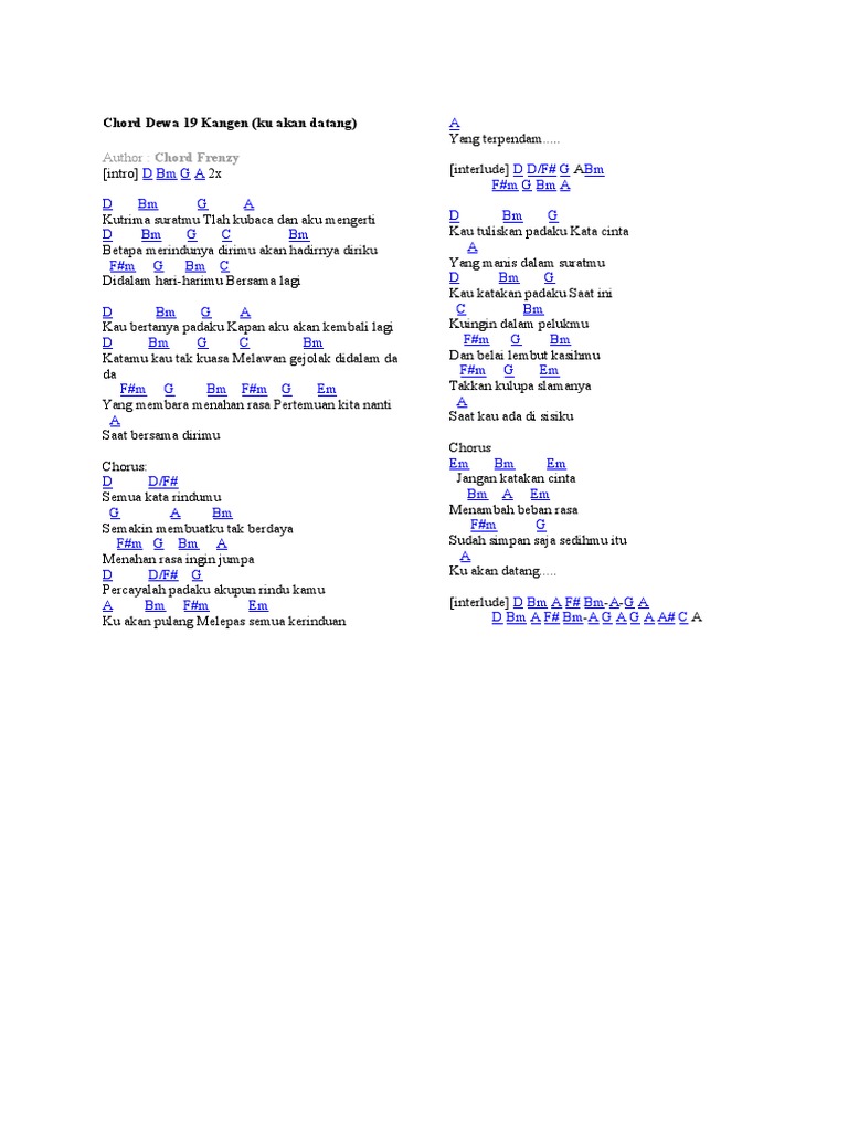 Em f am didalam hari harimu. D bm g c bm. Chord dewa 19 kangen ku akan datang intro d bm g a 2x d bm g a kutrima suratmu tlah kubaca dan aku mengerti d bm g c bm betapa merindunya dirimu akan hadirnya diriku fm g bm c didalam hari harimu bersama lagi d bm g a kau bertanya padaku kapan aku akan kembali lagi d bm g c bm katamu kau tak kuasa melawan gejolak didalam dada fm g bm fm g em yang membara menahan rasa pertemuan kita.