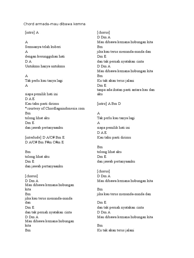 Chord kunci gitar lirik lagu armada mau dibawa kemana intro. Mau dibawa kemana hubungan kita bm jika kau terus menunda nunda dan dm e dan tak pernah nyatakan cinta d dm a mau dibawa kemana hubungan kita bm ku tak akan terus jalani dm e tanpa ada ikatan pasti antara kau dan aku intro a bm d a tak perlu kau tanya lagi a siapa pemilik hati ini d a e. Bm ku tak akan terus jalani dm e tanpa ada.