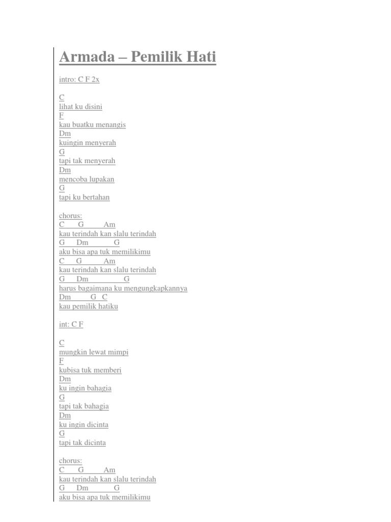 Armada harusnya aku. C f c f c lihat ku disini f kau buatku menangis dm tak ingin menyerah g tapi tak menyerah dm mencoba lupakan g tapi ku bertahan. Chord armada pemilik hatiku intro c f 2x c lihat ku disini f kau buatku menangis dm kuingin menyerah g tapi tak menyerah dm mencoba lupakan g tapi ku bertahan chorus c g am kau terindah kan slalu terindah g dm g aku bisa apa tuk memilikimu c g am kau terindah kan slalu terindah g dm g harus bagaimana ku mengungkapkannya dm g c kau pemilik hatiku int c f c mungkin lewat mimpi f kubisa.