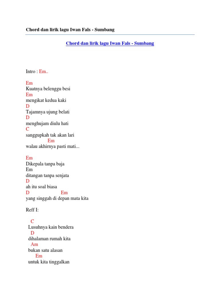 Chord kunci gitar dan lirik lagu sumbang dari iwan fals lusuhnya kain bendera selasa 1 oktober 2019 1911 tribunsolocom chord kunci gitar dan lirik lagu sumbang dari iwan fals. Em kuatnya belenggu besi em mengikat kedua kaki d tajamnya ujung belati d menghujam diulu hati c sanggupkah tak akan lari em walau akhirnya pasti mati. Kunci gitar iwan fals sumbang.