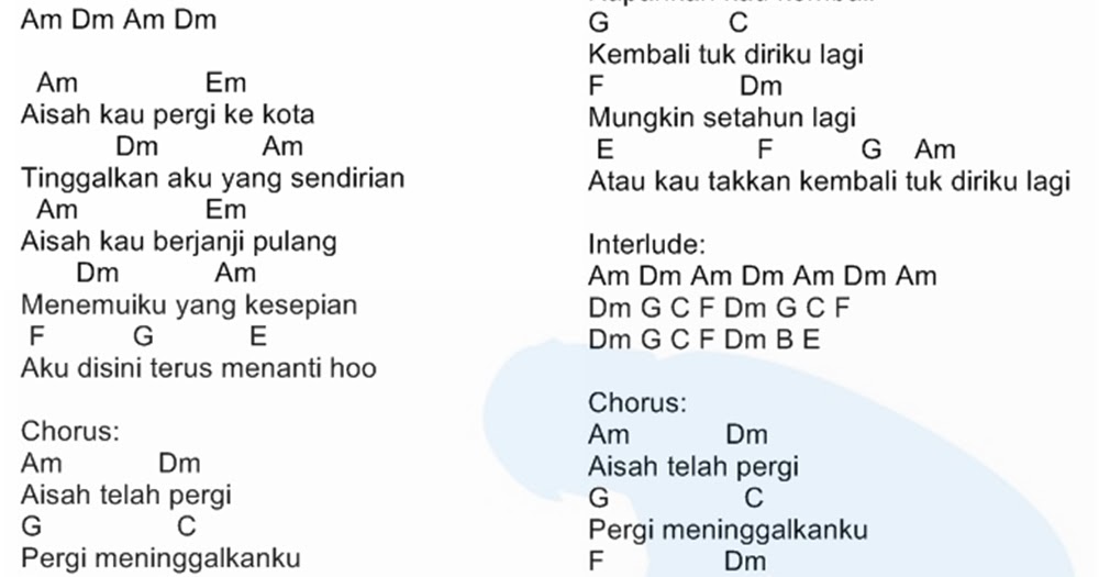 Chord five minutes aisah intro fm bm fm bm fm e fm e fm e aisah kau pergi ke kota bm fm tinggalkan aku yang sendirian fm e aisah kau berjanji pulang bm fm menemuiku yang kesepian d e c aku disini terus menanti chorus fm bm aisah telah pergi e a pergi meninggalkanku d bm mungkin suatu hari nanti c fm kau kan datang untukku f bm kapan kah kau kembali e a kembali tuk diriku. Intro cm fm b e a. Hingga ujung nyawa b kau disamping rasullallah.