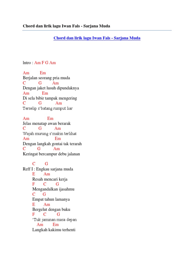 Chord iwan fals sarjana muda lntro. Am termenung lesu em engkau melangkah c dari pintu g kantor yang di h am arapkan am tergiang kata em tiada lowongan c untuk kerja g yang di damba am kan am tak peduli berusa em ha lagi c namun ka g ta sama yang kau am dapatkan am jelas menatap awan em berarak c wajah murung g smakin ter am lihat. Dm bb c dm dm am berjalan seorang pria muda f c dm dengan jaket lusuh dipundaknya dm am di sela bibir tampak mengering f c dm terselip sbatang rumput liar dm am jelas menatap awan berarak f c dm wajah murung s.