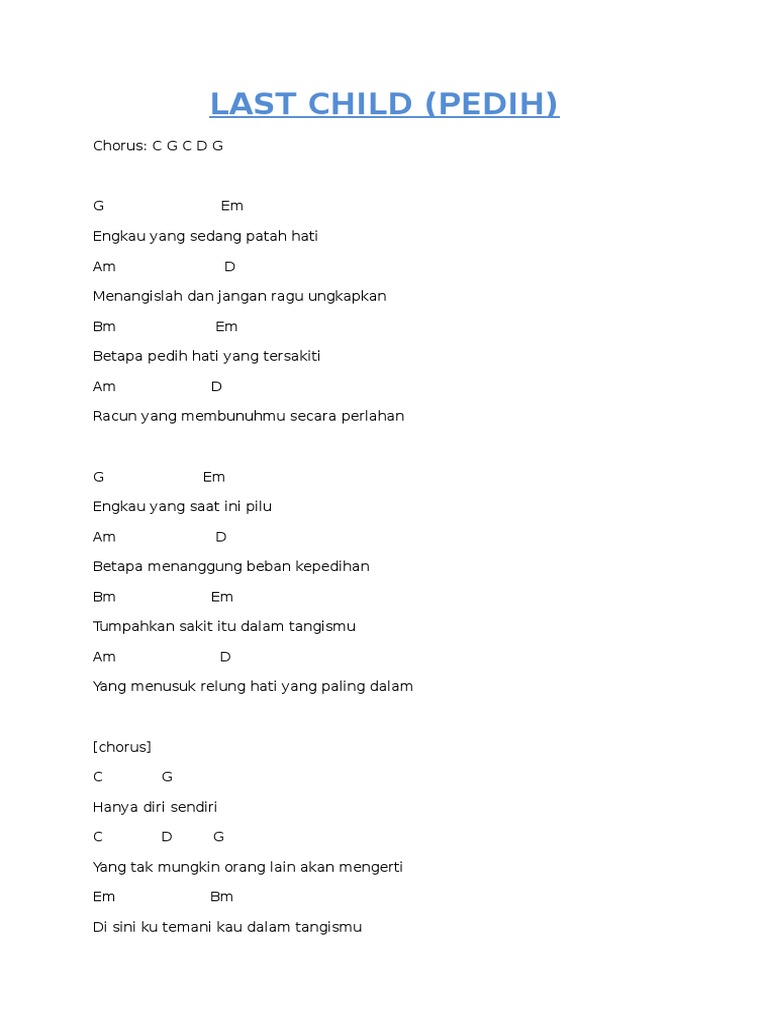 C g c d g g em engkau yang sedang patah hati am d menangislah dan jangan ragu ungkapkan. Tribunamboncom berikut chord gitar dan lirik lagu pedih last child. G em engkau yang sedang patah hati am d menangislah dan jangan ragu ungkapkan bm em betapa pedih hati yang tersakiti.