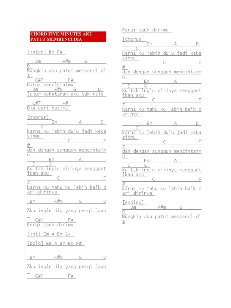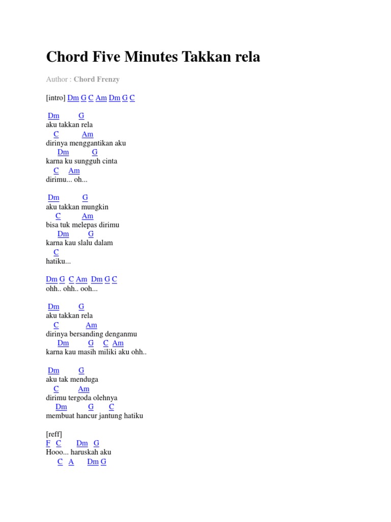 Chord kunci gitar five minutes bertahan dari nada dasar c capo di fret ke 2. G bm d a d f tak pernah terbayangkan bm b kumiliki wanita em a seperti dirimu d f tak pernah terfikirkan bm b kau kan pergi dariku em a pergi tinggalkanku g d kucoba tuk bertahan a bm dalam kisah ini g d tak bisakah sejenak a kau jangan pergi d f tak pernah terbayangkan bm b kumiliki wanita em a secantik dirimu d f tak mungkin kulakukan bm b kesalahan. Five minutes bertahan by.