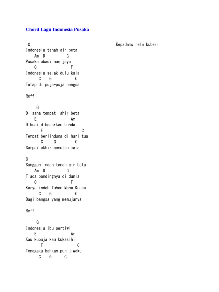 C indonesia tanah air beta am d g pusaka abadi nan jaya c f indonesia sejak dulu kala c g c selalu dipuja puja bangsa. Simak lirik dan chord lagu indonesia pusaka ciptaan ismail marzuki di bawah ini.
