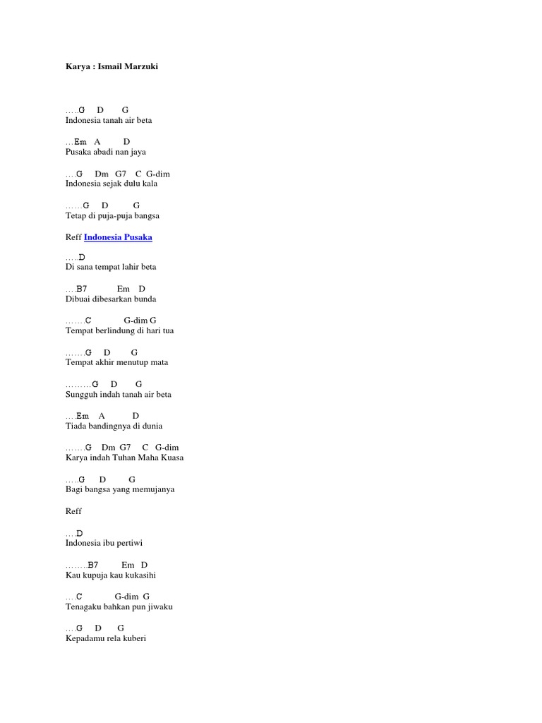 Lagu wajib nasional indonesia pusaka ciptaan. Indonesia pusaka chord intro c f c dm g c verse c indonesia tanah air beta am d g pusaka abadi nan jaya c f indonesia sejak dulu kala c g c slalu dipuja puja bangsa reff g di sana tempat lahir beta e am dibuai dibesarkan bunda f c tempat berlindung di hari tua c g c sampai akhir menutup mata. Chord ismail marzuki indonesia pusaka indonescia tanah air beta pusaamka adbadi nan jagya indocnesia sejak dulu fkala tetap cdi pugja puja bangcsa reff.
