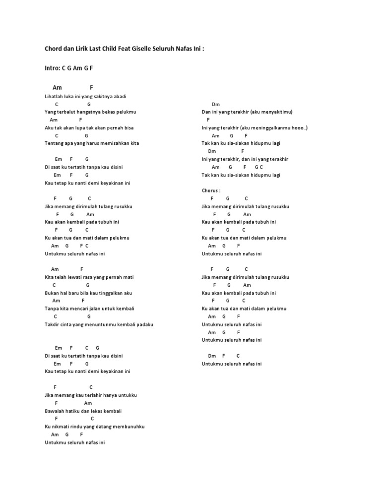 Chord seluruh nafas ini lihatlah luka ini yang sakitnya abadi yang terbalut hangatnya bekas jika memang dirimulah tulang rusukku kau akan kembali pada tubuh by last child. Last child seluruh nafas ini chord intro c g am g f verse am f lihatlah luka ini yang sakitnya abadi c g yang terbalut hangatnya bekas pelukmu am f aku tak akan lupa tak akan pernah bisa c g tentang apa yang harus memisahkan kita em f g di saat ku tertatih tanpa kau disini em f g kau tetap ku nanti demi keyakinan ini f g c jika memang dirimulah tulang rusukku f g am kau akan kembali pada. Smash last child rindumu di sana.