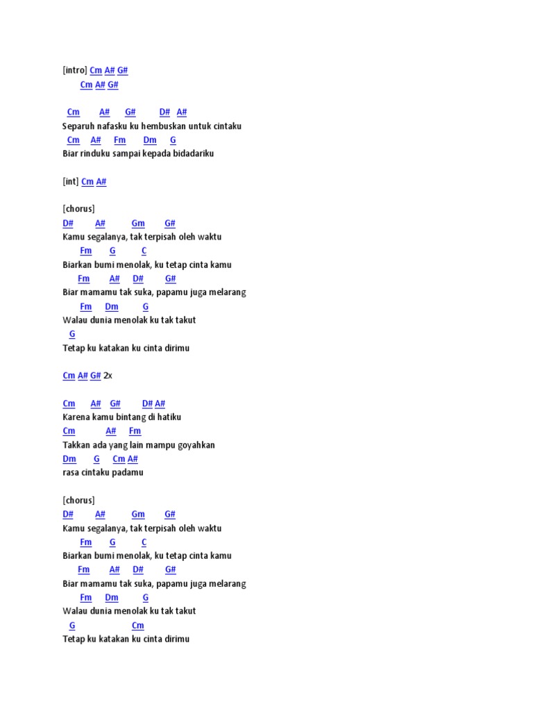 Am c f am c f am em separuh nafasku f c g ku hembuskan untuk cintaku am em biar rinduku dm b e am g sampai kepada bidadariku. Am c f am c fam em separuh nafasku f c g ku hembuskan untuk cintaku am em biar rinduku. Request chord services organizes chords collection.