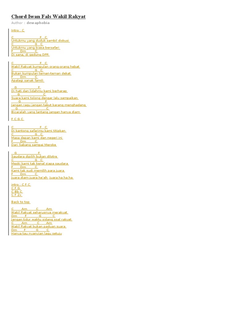 C c f c untukmu yang duduk sambil diskusi c g c untukmu yang biasa bersafari f dm c di sana di gedung dpr wakil rakyat kumpulan orang orang hebat bukan kumpulan teman teman dekat apalagi sanak famili g f di hati dan lidahmu kami berharap g c suara kami tolong dengar lalu sampaikan g f jangan ragu jangan takut karang menghadang g c bicaralah yang lantang. Chord iwan fals wakil rakyat intro. Iwan fals wakil rakyat chord intro c verse c f c untukmu yang duduk sambil diskusi c g c untukmu yang biasa bersafari f dm c di sana di gedung dpr wakil rakyat kumpulan orang orang hebat bukan kumpulan teman teman dekat apalagi sanak famili g f di hati dan lidahmu kami berharap g c suara kami tolong dengar lalu sampaikan g f jangan ragu jangan takut karang menghadang g c bicaralah.