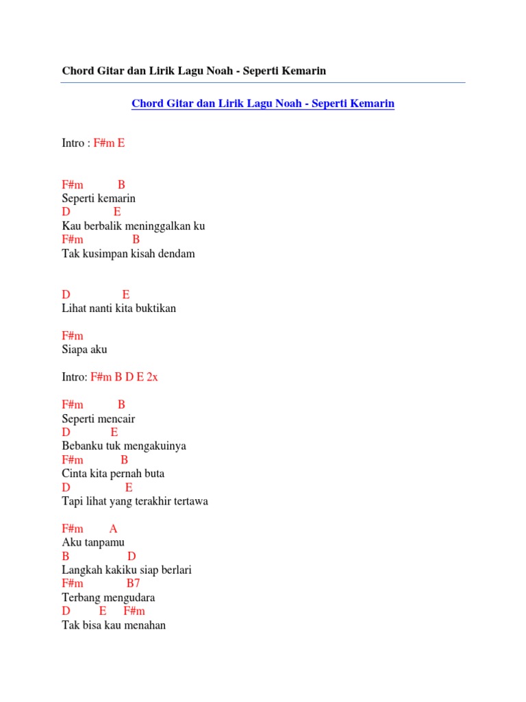 Chord Gitar Dan Lirik Lagu Noah Seperti Kemarin Lirik Lagu Indonesia Raya Pianika