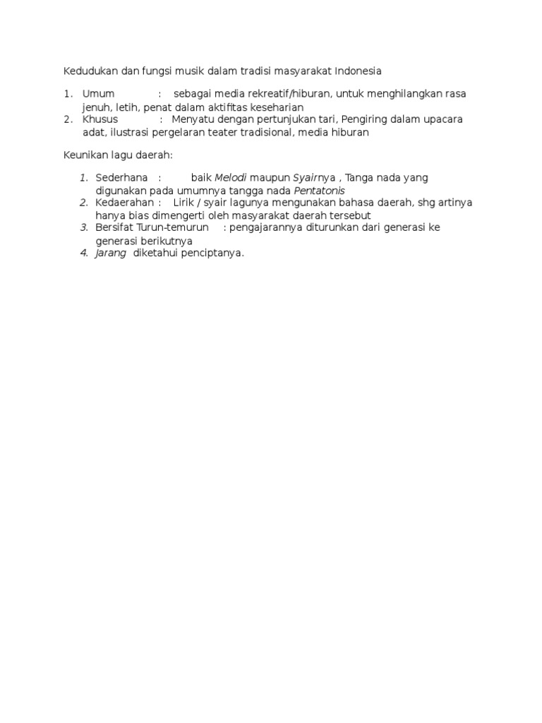 Mengatasi spasi berantakan dari word 2010 ke word 2007. Keanekaragaman jenis karya musik dan bentuk alat musik yang tumbuh dalam kehidupan masyarakat memiliki kedudukan dan fungsi yang berbeda. Lagu daerah pada umumnya mengandung nilai nilai kehidupan dan unsur unsur kebersamaan serta menceritakan tentang keadaan lingkungan.
