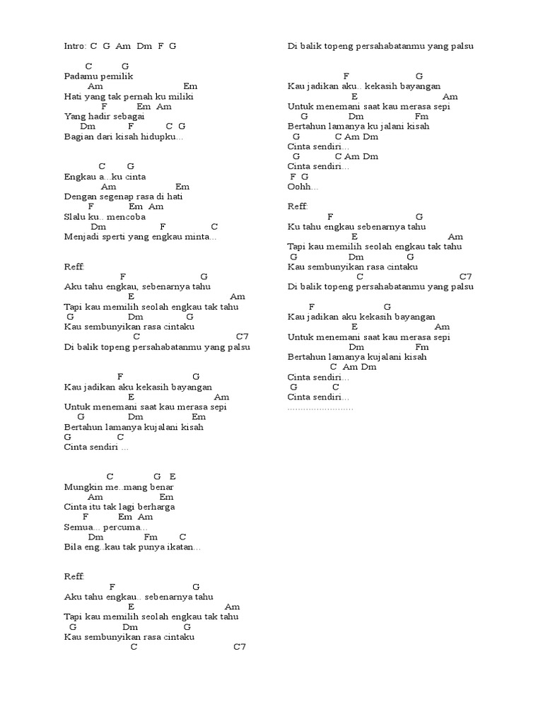 Cakra khan kekasih bayangan chord intro c gb a a dm g c g padamu pemilik am em hati yang tak pernah ku miliki f em am yang hadir sebagai dm f c g bagian dari kisah hidupku c g engkau aku cinta am em dengan segenap rasa di hati f em am selalu ku mencoba dm f c menjadi seperti yang engkau minta chorus f g aku tahu engkau sebenarnya tahu e. Kau jadikan aku kekasih bayangan e. Cem am admf g c.