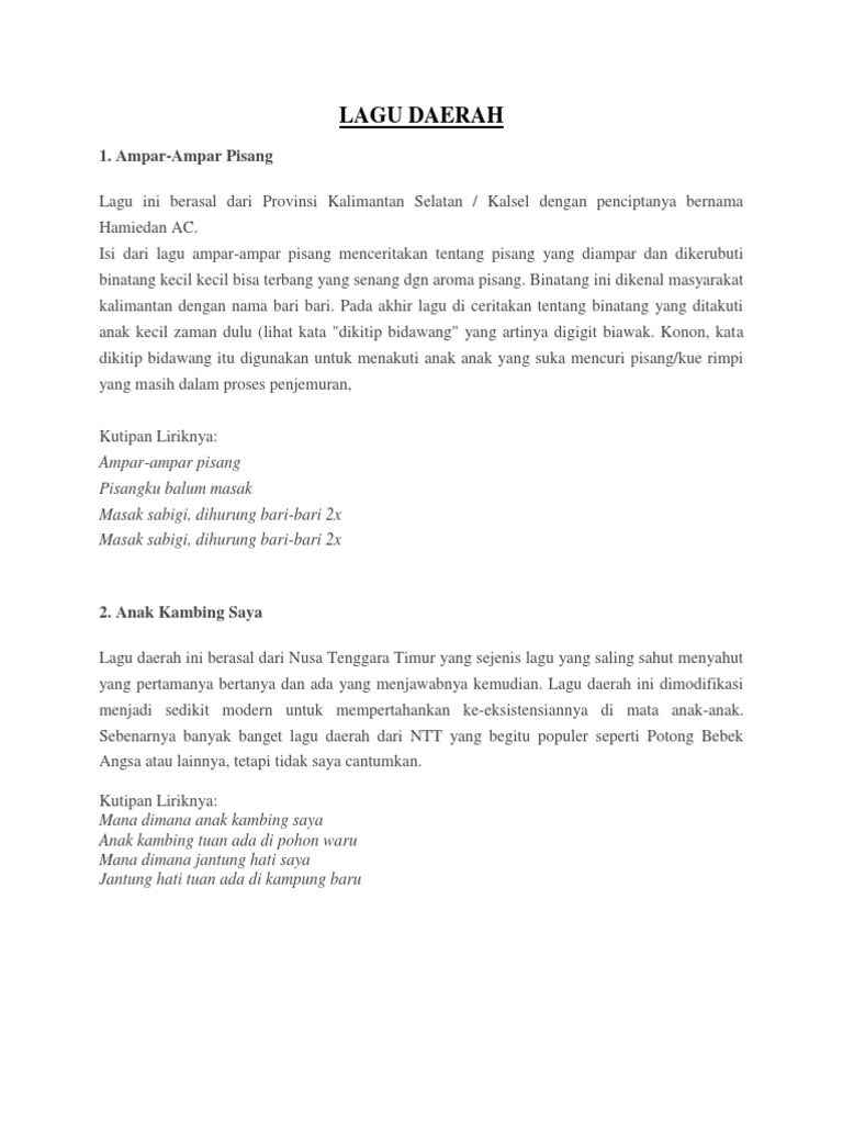 Tapanuli alusi au nusa tenggara anak kambing saya lirik lagu ampar ampar pisang lirik ampar ampar pisang ampar ampar pisang lagu ampar ampar pisang lirik lagu ampar ampar pisang kalimantan selatan. Dalam lagu yang terlihat menyenangkan dan enerjik tersebut sebenarnya memiliki sebuah makna dan cerita yang terkandung di dalamnya yang dibagi dalam 5 makna. Lagu ampar ampar pisang telah menjadi bagian dalam lagu lagu daerah yang menjadi sebuah meteri pembelajaran dalam pelajaran di sekolah dasar atau sekolah lanjutan berikutnya.