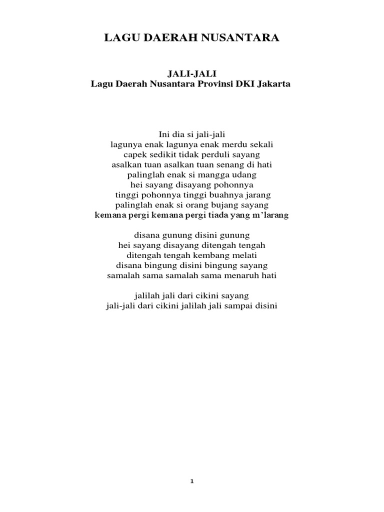 Karena kentalnya lagu tersebut baik lirik atau gaya bahasanya dalam kebudayaan dan khaznah alam betawi maka lagu tersebut ditetapkan sebagai lagu daerah betawi jakarta dalam cerita sejarah yang beredar di masyarakat lagu jali jali merupakan lagu yang dipopulerkan oleh m. Lirik lagu pengiring dalam tarian ini adalah sebagai berikut. Ini dia si jali jali lagunya enak lagunya enak merdu sekali capek sedikit tidak perduli sayang.