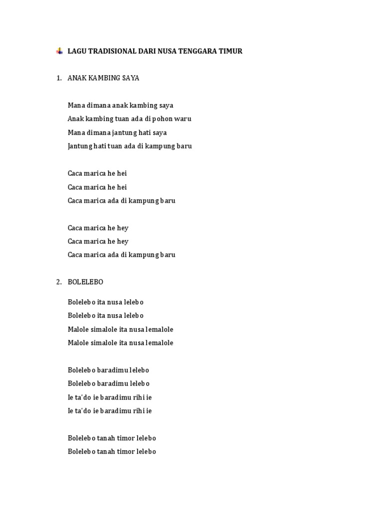 Lagu lagu dari nusa tenggara timur ini pun masih dilestarikan sampai sekarang beberapa lagu seperti potong bebek angsa desaku dan anak kambing saya dikenal luas sebagai lagu nusantara terpopuler. Lagu daerah nusa tenggara timur nusa tenggara timur adalah salah satu provinsi yang ada di indonesia dan memiliki berbagai pulau. Lagu daerah nusa tenggara timur tidak hanya hanya sekedar kaya akan keindahan alamnya yang mempesona atau kulinernya yang lezat saja provinsi nusa tenggara timur ternyata juga memiliki berbagai kesenian tradisional yang sangat terkenal.