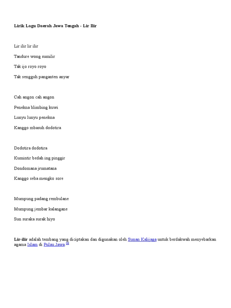 Home terjemahan jawa lirik lagu jawa tengah lir ilir dan terjemahannya. Lirik lagu jawa tengah lir ilir dan terjemahannya jawa tengah lir ilir lirik lagu dan terjemahannya dalam arti bahasa indonesia. Asal daerah lagu lir ilir.