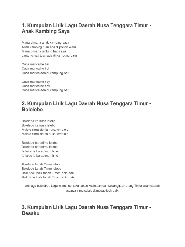 Mana dimana anak kambing saya dm g f c anak kambing tuan ada di pohon waru c f c mana dimana jantung hati saya dm g f c jantung hati tuan ada di kampung baru f caca marica he hei c caca marica he hei dm g f c caca marica ada di kampung baru f caca marica he hei c caca. Download lagu daerah ntt anak kambing saya mp3 hanya di herry lagublogspotcoid gratis ini hanya sekedar untuk review lagu saja dan semata mata sebagai hiburan. Lirik lagu daerah mana di mana anak kambing saya.