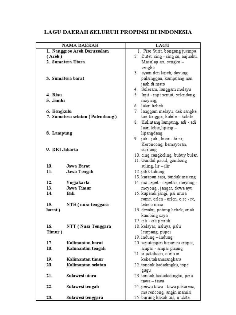 3 suku besar yaitu sunda mayoritas betawi wilayah kotakab bekasi depok dan wilayah utara kabupaten bogor jawa cirebon indramayu dsk. Nama 33 provinsi di indonesia lengkap dengan pakaian tarian rumah adat senjata tradisionalsukupeta dan gambar nama provinsi di sumatera indonesia 1. Lagu lagu daerah di indonesia beserta daerah asalnya lagu daerah adalah lagu yang berasal dari suatu daerah tertentu dengan lirik lagu yang biasanya menggunakan bahasa daerah masing masing namun ada juga yang menggunakan bahasa indonesia sebagai lirik lagunya.