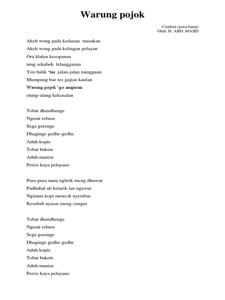 Warung pojok akeh wong padha kedanan masakan akeh wong padha kelingan pelayan ora klalen kesopanan ning sekabeh lelangganan yen balik tas jalan jalan mingguan mumpung bae tas gajian kaulan warung pojok go ampiran etung etung ke kenalan tobat dhendhenge emi rebuse sega gorenge dhaginge gedhe gedhe adhuh kopie tobat bukete adhuh manise persis kaya pelayane pura pura mata mlirik meng. Notasi balok dan angka lagu. Lagu yang berasal dari cirebon ini menceritakan tentang kenenakan dan pelayanan di wrung pojok.