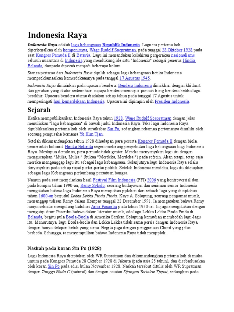 Indonesia raya adalah lagu kebangsaan republik indonesialagu ini pertama kali diperkenalkan oleh komponisnya wage rudolf soepratman pada tanggal 28 oktober 1928 pada saat kongres pemuda ii di batavialagu ini menandakan kelahiran pergerakan nasionalisme seluruh nusantara di indonesia yang mendukung ide satu indonesia sebagai penerus hindia belanda daripada dipecah menjadi beberapa koloni. Lagu kebangsaan republik indonesia ini pernah dipermasalahkan oleh seorang seniman senior indonesia yang bernama remy sylado pada sekitar tahun 1990 an. Supratman untuk menggambarkan semangat dan cita cita kaum pergerakan kebangsaan itu menerbitkan kegelisahan di mata kolonialisme.