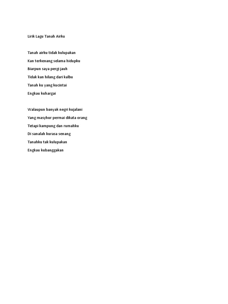 Sonoraid berikut lirik lagu nasional indonesia tanah air tanah airku tidak kulupakan. Ibu sud tanah airku tidak kulupakan kan terkenang selama hidupku biarpun saya pergi jauh tidak kan hilang dari kalbu tanah ku yang kucintai engkau kuhargai walaupun banyak negri kujalani yang masyhur permai dikata orang tetapi kampung dan rumahku di sanalah kurasa senang tanahku tak kulupakan. Tanah ku yang kucintai.