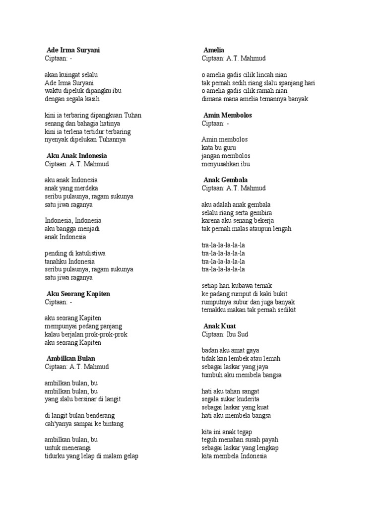 Lirik lagu anak indonesia ciptaan at mahmud Indeed recently has been sought by consumers around us, perhaps one of you. People now are accustomed to using the internet in gadgets to see image and video information for inspiration, and according to the title of the post I will discuss about Lirik Lagu Anak Indonesia Ciptaan At Mahmud.