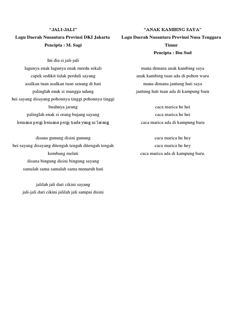 10 lagu daerah dan penciptanya lengkap dengan daerah asalnya seperti anak kambing saya anging mamiri manuk dadali injit injit semut gundul pacul keroncong kemayoran ampar ampar pisang rasa sayange ayam den lapeh dan ambon manise. Berikut lirik dan chord lagu anak kambing saya. Kalimantan selatan ampar ampar pisang papua irian jaya apuse lirik lagu caca marica lirik lagu anak kambing lagu caca marica caca marica lirik caca marica nusa tenggara.