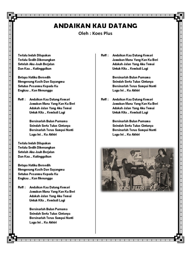 Lirik lagu andaikan kau datang kembali koes plus Indeed recently is being hunted by consumers around us, perhaps one of you. Individuals are now accustomed to using the internet in gadgets to see video and image information for inspiration, and according to the title of this article I will discuss about Lirik Lagu Andaikan Kau Datang Kembali Koes Plus.
