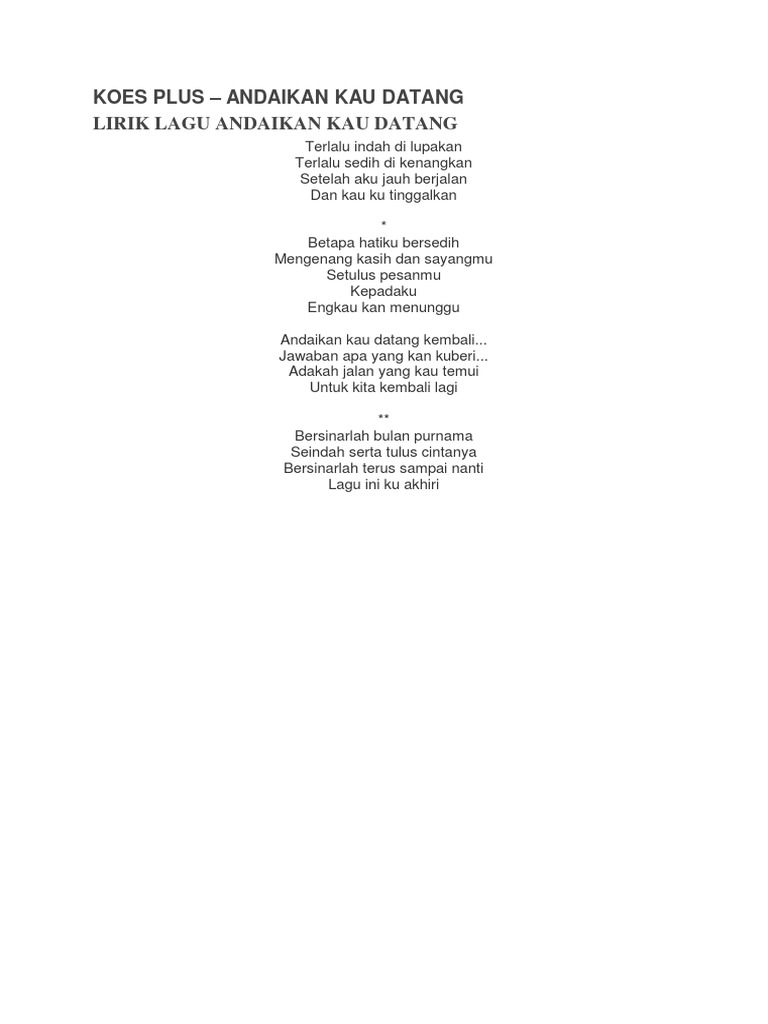 Terlalu indah dilupakan terlalu sedih dikenangkan setelah aku jauh berjalan dan kau ku tinggalkan. Andaikan kau datang kembali jawaban apa yang akan ku beri adakah cara yang kau temui untuk kita kembali lagi. Dipopulerkan oleh koes plus andaikan kau datang kembali sudah sering dinyanyikan ulang oleh para musisi tanah air.