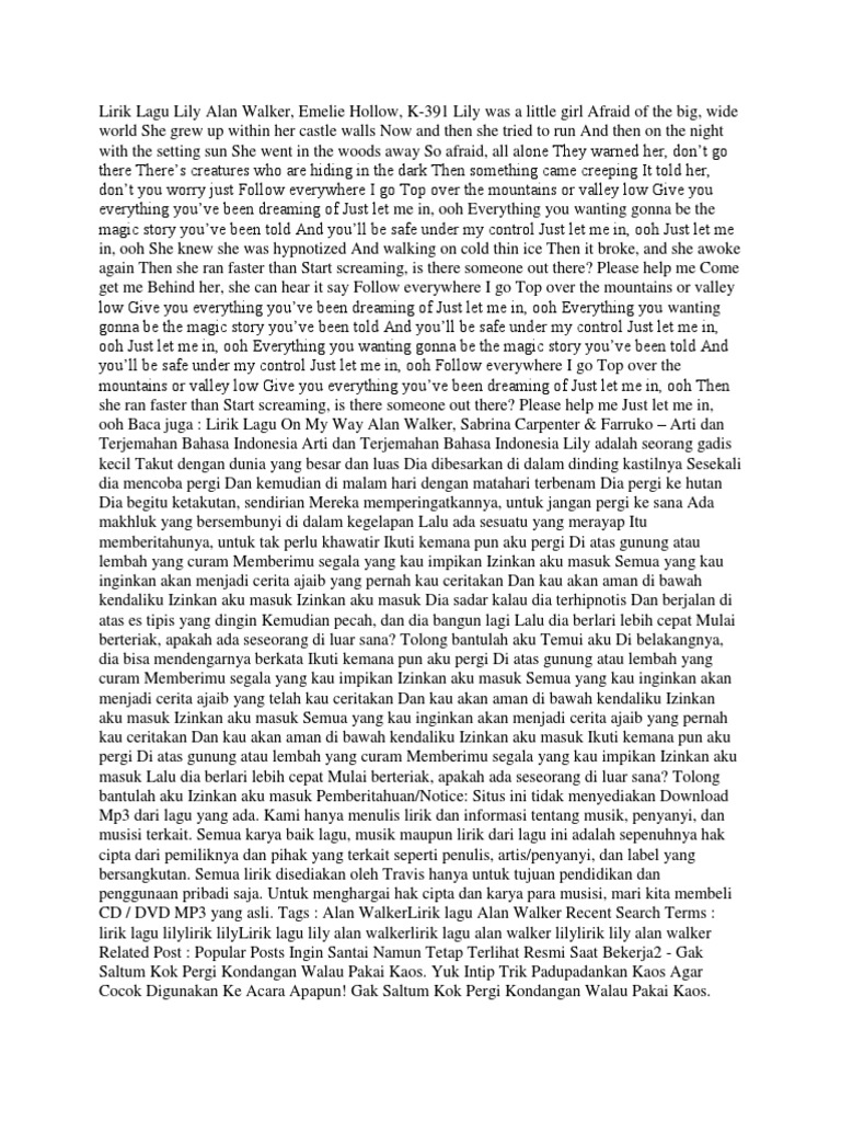Terjemahan lirik lagu lily alan walker k 391 emelie hollow adalah arti lirik lagu yang diterjemahkan secara langsung dari lirik bahasa inggris dengan penyesuaian lagu yang sudah cocokkan sehingga aman buat kamu menyanyikan lagunya tanpa salah lirik. Arti lirik lagu dari lirik alan walker lily dan terjemahan lily adalah gadis yang sangat yang membutuhkan petualangan dan. Lily was a little girl.