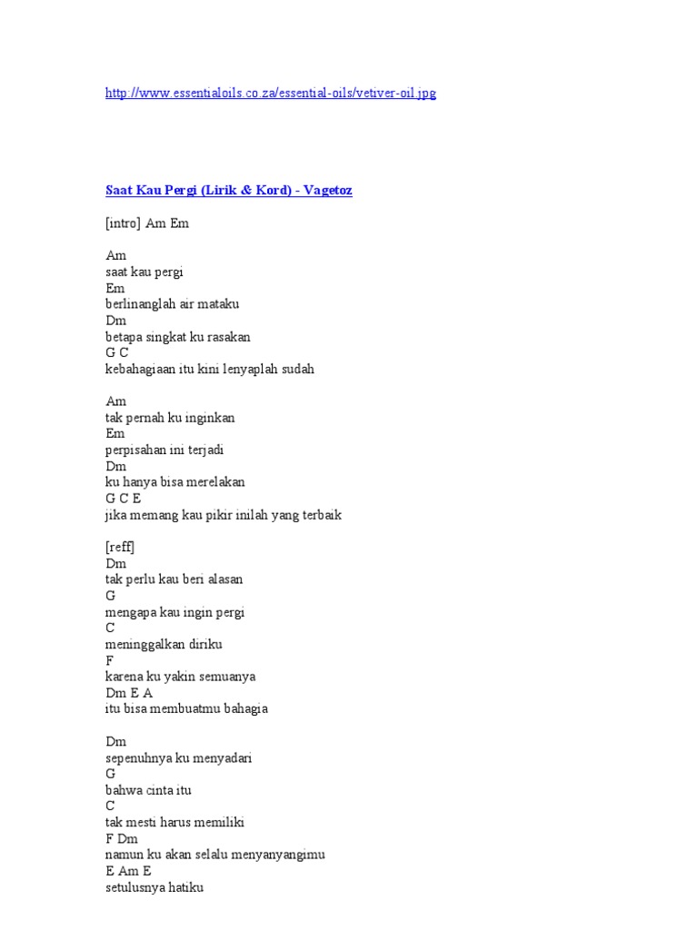 Berikut lirik dan chord lagu saat kau pergi dari vagetoz. Vagetoz saat kau pergi intro am em am saat kau pergi em berlinanglah air mataku dm betapa singkat ku rasakan g c kebahagiaan itu kini lenyaplah sudah am tak pernah ku inginkan em perpisahan ini terjadi dm ku hanya bisa merelakan g c e jika memang kau pikir inilah yang terbaik chorus dm tak perlu kau beri alasan g mengapa kau ingin pergi c meninggalkan diriku f karena ku yakin mungkin. Dm tak perlu kau beri alasan g mengapa kau ingin pergi c meninggalkan diriku f karena ku yakin mungkin dm bm7 5 semuanya itu bisa e a membuatmu bahagia.