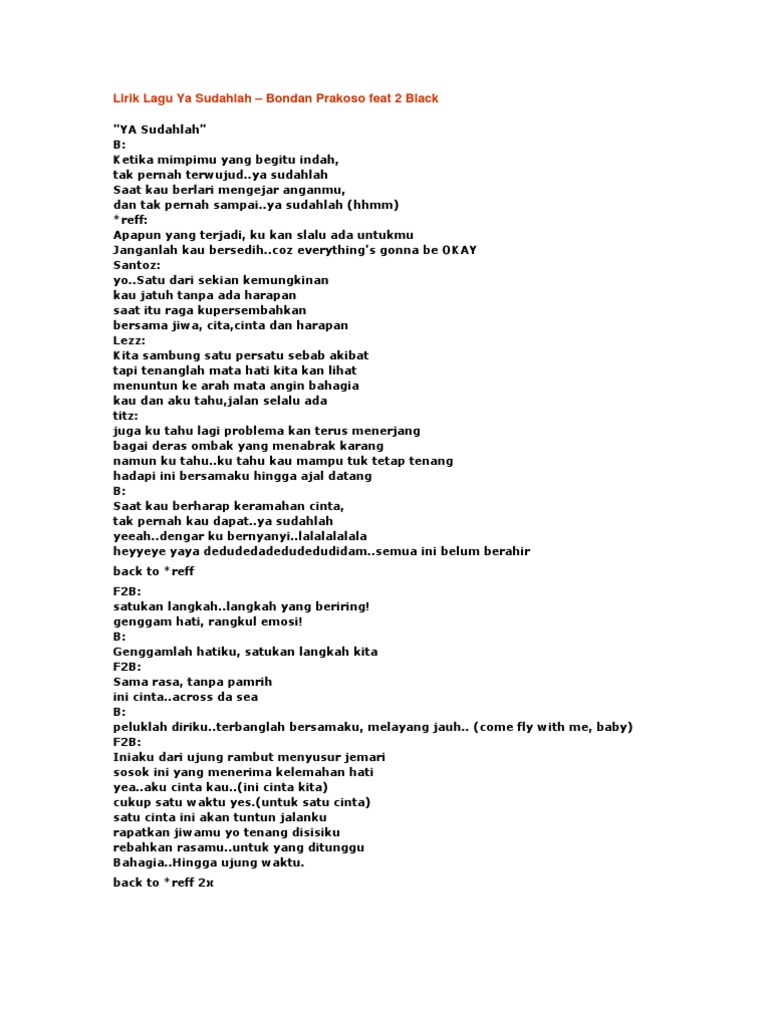Ketika mimpimu yang begitu indah tak pernah terwujudya sudahlah saat kau berlari mengejar anganmu dan tak pernah sampaiya sudahlah hhmm reff. Ketika mimpimu yang begitu indah tak pernah terwujud ya sudahlah saat kau berlari mengejar anganmu dan tak pernah sampai ya sudahlah hmm. Lirik lagu ya sudahlah dipopulerkan oleh bondan prakoso feat fade2black.