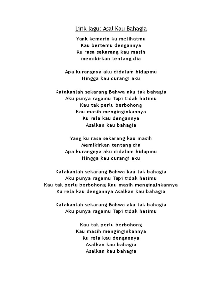 Lirik lagu asal kau bahagia armada lyrics asal kau bahagia yang kemarin ku melihatmu kau bertemu dengannya ku rasa sekarang kau masih memikirkan tentang dia apa kurangnya aku di dalam hidupmu hingga kau curangi aku katakanlah sekarang bahwa kau tak bahagia aku punya ragamu tapi tidak hatimu.