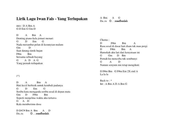 Lirik yang terlupakan oleh iwan fals. Lirik yang terlewatkan dari sheila on 7 ini dipublikasikan pada tanggal 14 october 2008 12 tahun yang lalubelum ada info detil tentang single ini. Chord disederhanakan versi originalnya dibawah.