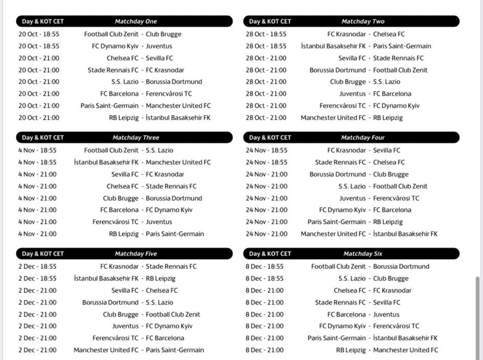 Check out every fixture in this seasons champions league with the first group stage games being played on tuesday oct. Full group stage fixture schedule 2020 21. Et 8 pm.